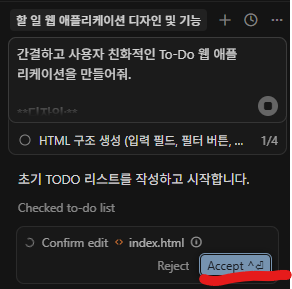 작성하고 시작을 누르게 되면 AI가 알아서 파일을 생성하고 코딩을 진행하게 되는데 가끔씩 권한이 필요한 경우 사용자에게 권한요청을 하면서 중간에 멈추게 됩니다.