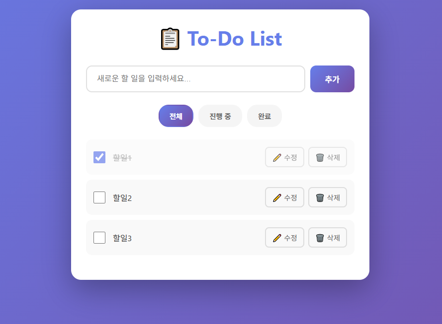 * **할 일 필터링:** '전체', '진행 중', '완료' 세 가지 상태로 목록 필터링 기능.