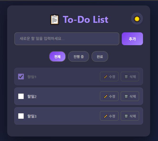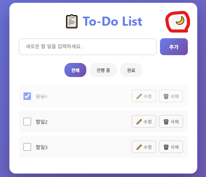 * **할 일 완료/미완료:** 각 할 일 옆에 체크박스를 두어 완료 상태를 토글.