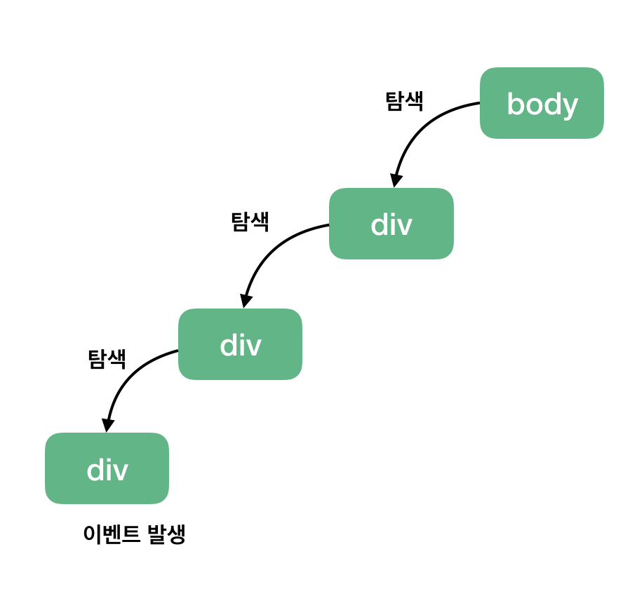 위의 사진과 같이 위에서부터 타고내려오는 형식으로 특정 이벤트가 발생하면 최상위 요소부터 최하위 요소까지 해당 태그를 찾아 내려간다. ( 실제 코드에서는 자주 쓰이지 않는다 )