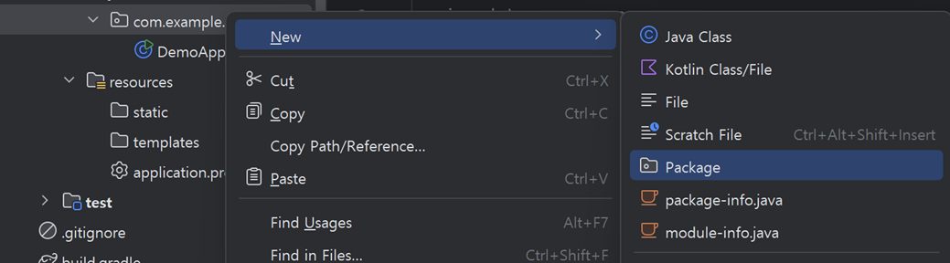 위의 사진처럼 com.example.demo 부분에서 마우스 오른쪽클릭 -> New -> Package를 선택하여 줍니다.