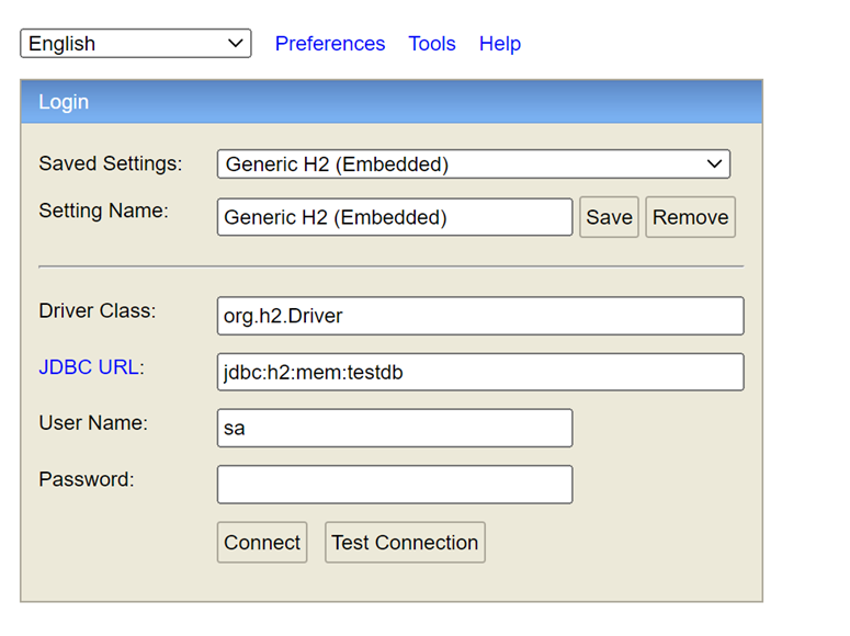 http://localhost:8080/h2-console 부분에 접속을 하게 되면 아래 사진과 같은 창이 뜨게 됩니다.