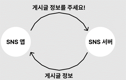 SNS 앱의 게시판 탭에 들어가게 되면, 스마트폰에서 해당 SNS앱의 서버에 “다른 사람들이 올린 게시글을 보여줘!”라고 요청을 보내게 됩니다.