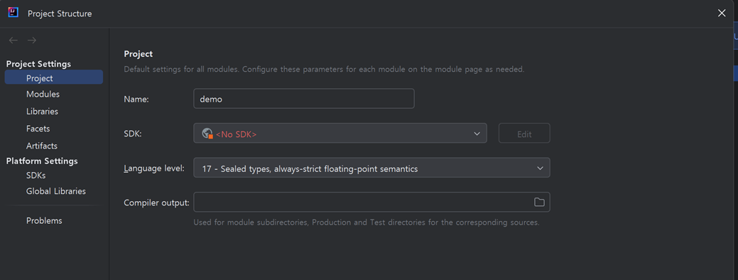인텔리제이에서 File -> Project Structure -> Project로 접근하면 SDK 부분이 <No SDK>로 되어 있는 것을 확인할 수 있습니다.