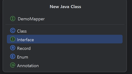 DemoMapper의 경우 아래와 같이 Class 파일이 아닌 Interface로 생성해 줍니다.