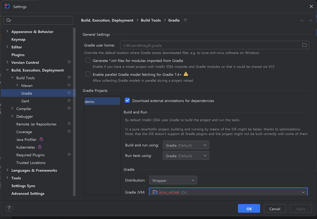 Gradle 부분의 Gradle JVM 부분에서도 이전에 설치한Corretto-17 버전을 선택 후 Apply -> OK로 설정을 진행합니다.