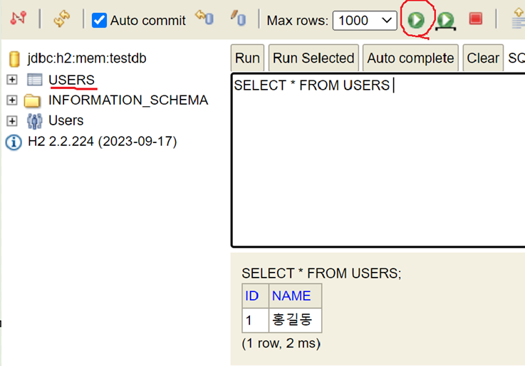 위에서 작성된 코드의 쿼리를 살펴보면 USERS 테이블에서 특정 id를 가진 사용자의 id와 name을 불러오는 내용입니다. 하지만 USERS라는 테이블은 아직 생성하지 않은 관계로 아래에서 자동으로 생성되게 만들어보겠습니다. ( * 테이블이란 쉽게 말해 데이터를 표 형식으로 나타낸 구조입니다 )