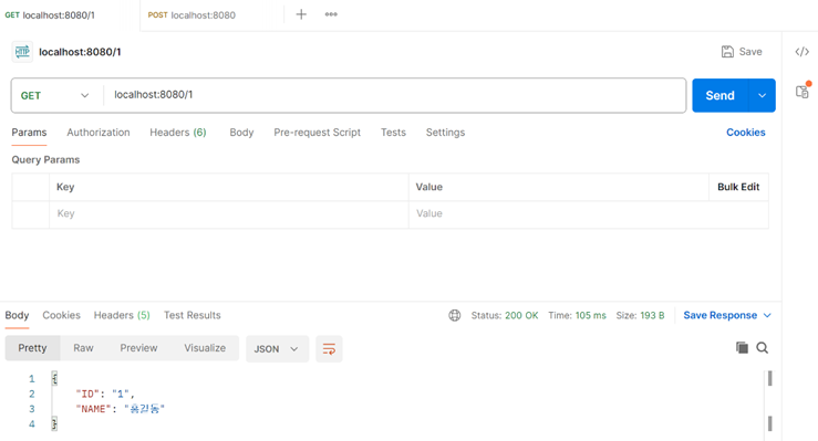 서버를 킨 후 URL 입력부분에 http://localhost:8080/1 http://localhost:8080/1을 입력해서 Send버튼을 눌러봅시다. 아래 Response부분에 아무것도 안 나오게 된다면 성공입니다.