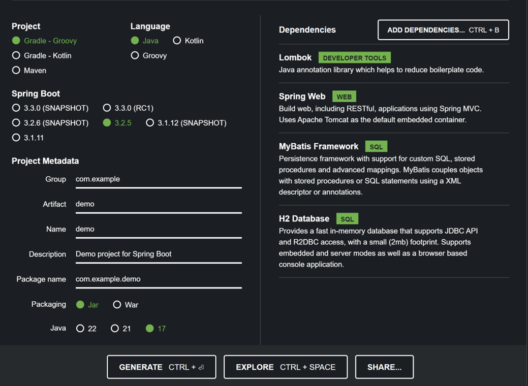 자바 버전은17 버전을 선택하였고, Dependency 부분의 경우 프로젝트에 필요한 라이브러리들을 추가한 내용입니다.